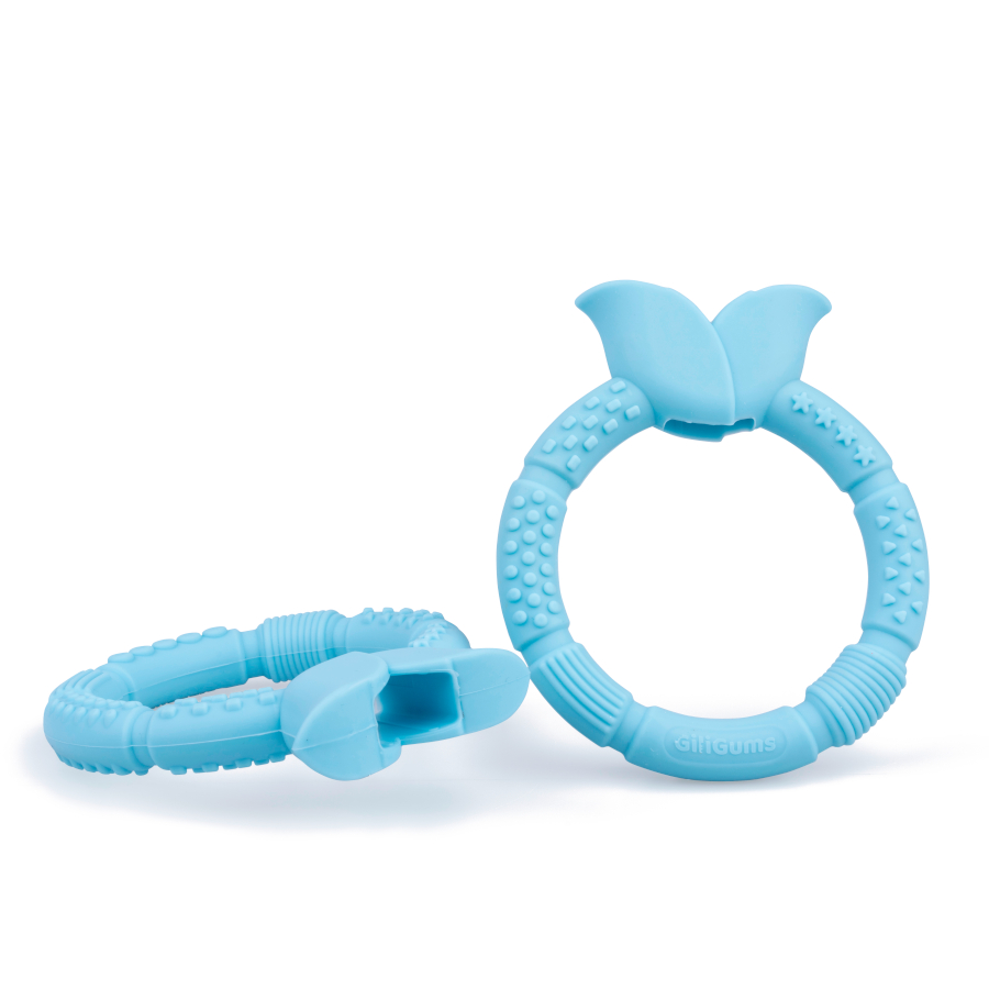 Grița albastră va fi un accesoriu adorabil pentru bebeluși. Forma mărgelor facilitează prinderea de către micile mâini, iar diversele texturi ale suprafeței și protuberanțele ajută la erupția dinților, masând ușor gingiile inflamate.