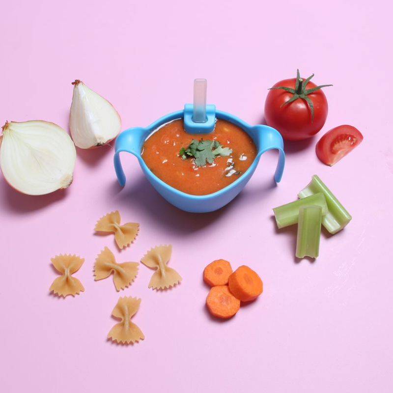 O soluție practică și inovatoare care facilitează copilului consumul de mese, inclusiv al celor cu consistență lichidă sau semi-lichidă. Bolul compact cu mânere are o pai brevetați și un inserț care îl transformă într-un pahar fără vărsare. În plus, conținutul poate fi sigilat cu un capac inclus în set.