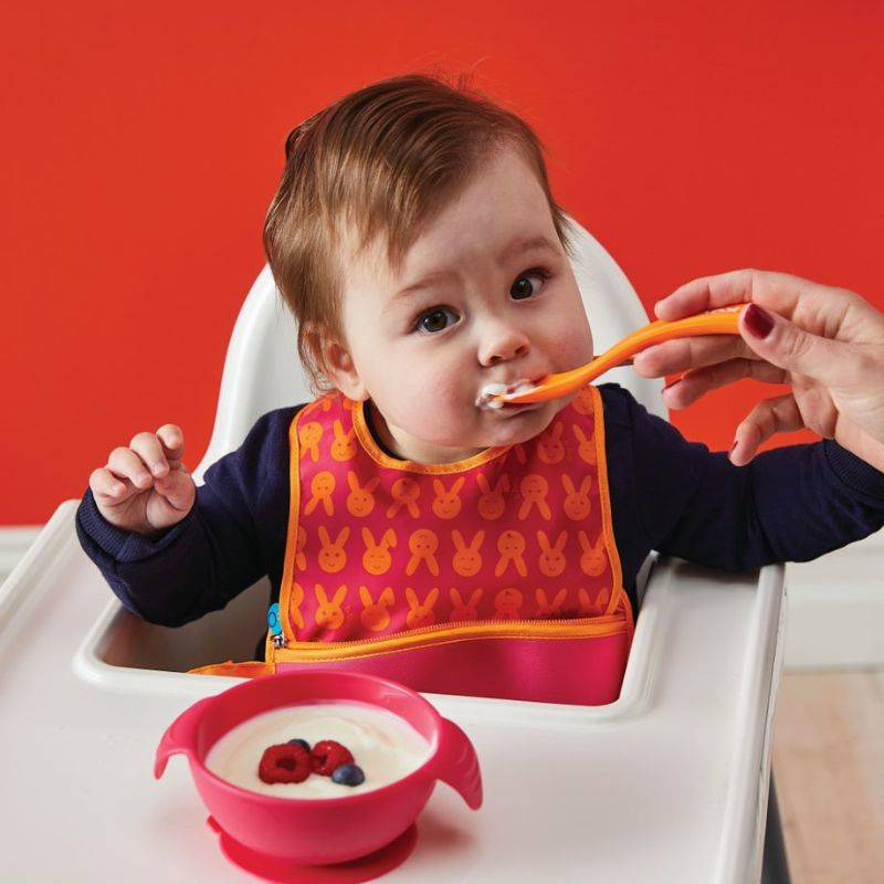 Setul b.box pentru hrănirea copilului este un set practic care include o căniță din silicon cu vacuum și mânere plus o linguriță flexibilă, ideal pentru primele mese ale micuțului care învață să mănânce singur.