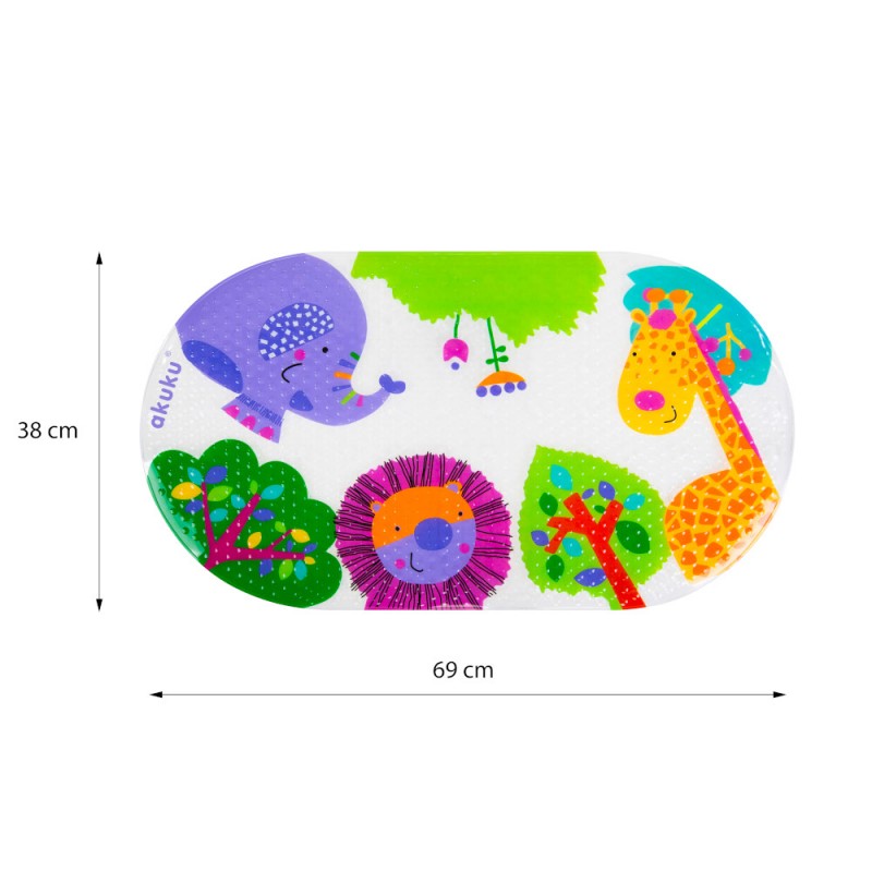 Covorașul antiderapant „akuku” este conceput pentru a fi utilizat în căzile de baie, căzile de baie și dușurile copiilor. Acesta asigură siguranța în timpul îmbăierii. Imprimeul colorat va adăuga varietate îngrijirii zilnice. Avantajele covorașului: – crește siguranța în timpul îmbăierii, – are ventuze care împiedică alunecarea covorașului, – ușor de utilizat, – antiderapant, protejează împotriva alunecării, – nu conține ftalați, – fabricat din PVC de înaltă calitate. Instrucțiuni de utilizare: Pentru a fixa corect covorașul, umpleți mai întâi cada cu apă, apoi introduceți covorașul și apăsați uniform. După fiecare baie, spălați covorașul cu săpun pentru bebeluși. Clătiți și lăsați să se usuce. Atenție! Copilul dumneavoastră trebuie să fie sub supravegherea unui adult în timpul îmbăierii. Covorașul nu trebuie dezinfectat, turnat cu apă clocotită, fiert sau spălat în mașina de spălat vase. Dacă există semne de uzură, aruncați-l! Produsul nu conține bisfenol A (0% BPA). În pachet: 1 buc. Dimensiuni covoraș: 69 x 39 cm