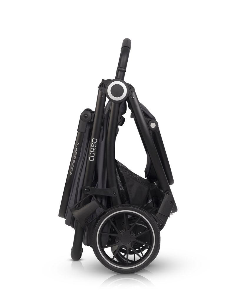 - Compact: Se pliază ușor cu scaunul montat în ambele direcții.