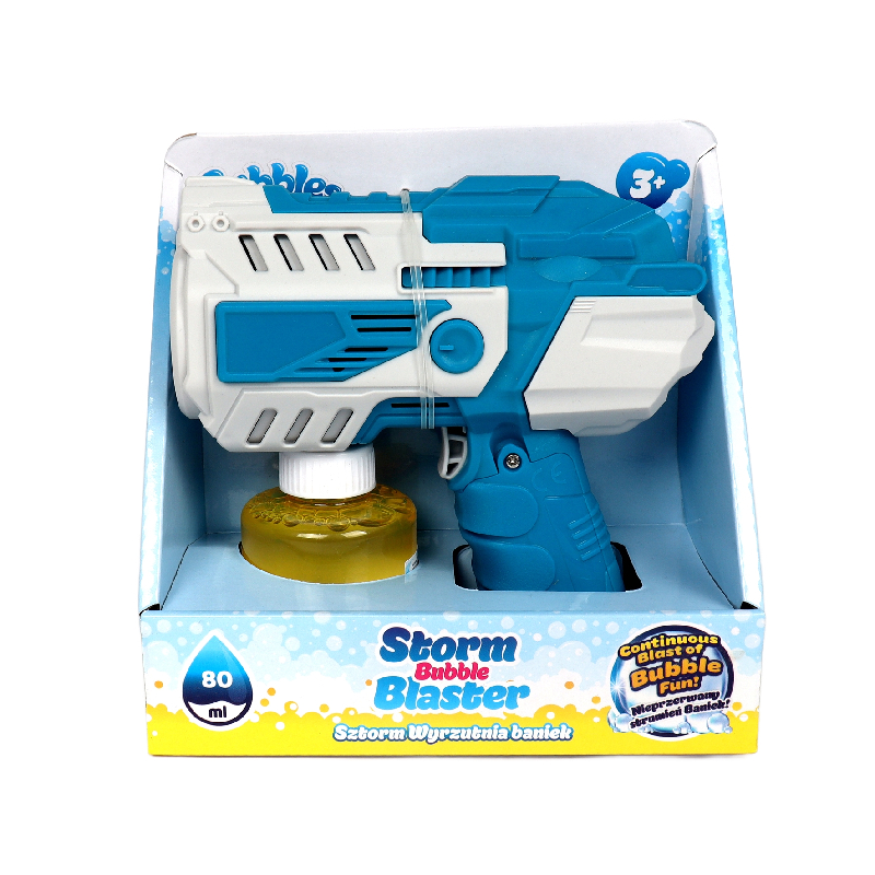 Sztorm este o pistol, care, în ciuda dimensiunilor sale compacte, poate „magia” o mulțime de bule! Pentru a începe distracția, trebuie să pui în pistol sticluța cu lichidul inclus în set, să alimentezi jucăria cu baterii și să apeși pe trăgaci, iar din țeavă va ieși un flux continuu de bule! Pistolul trebuie folosit în aer liber.