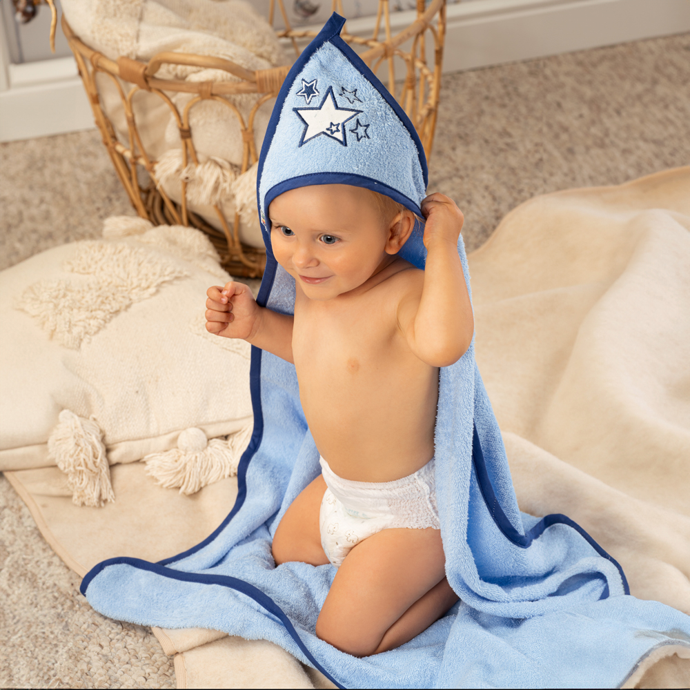 Prosop de baie cu glugă 100x100cm Stele. Acest prosop de baie este fabricat din țesătură pufoasă de bumbac terry. Este esențial încă de la prima baie. Absoarbe perfect umezeala și îl protejează eficient pe micuț de frig. Prosopul este excepțional de moale și delicat, așa că nu irită pielea. Croiala lejeră nu restricționează și nu îngrădește mișcarea bebelușului. Gluga cusută protejează capul ud. Dimensiunea mare a prosopului vă va permite să vă bucurați de el mai mult timp. Puteți înfășura cu ușurință atât un bebeluș, cât și un copil mai mare după baie. Acest produs nu este o jucărie. A nu se lăsa la îndemâna copiilor. Pentru a evita riscul de sufocare, țineți ambalajul departe de copii. Notă: Instrucțiunile de spălare sunt pe etichetă. Dimensiune: 100x100cm Compoziție: 100% bumbac Potrivit pentru copii de la 0 luni în sus