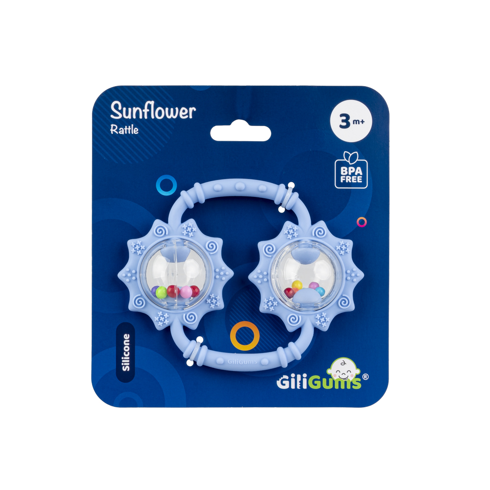 Răgălită dublă, înfățișată sub o formă adorabilă a două floarea-soarelui unite, va distra micuțul și va calma gingiile dureroase! Jucăria are două bile umplute cu mărgele colorate, care țușcă vesel atunci când sunt agitate. Acestea sunt înconjurate de inele moi, formând forma unor flori, care sunt decorate cu proeminențe de diferite forme. Atunci când este mușcată, proeminențele vormasa delicat gingiile iritate de erupția dentară, aducându-i bebelușului alinare. Forma jucăriei, adaptată pentru mâinile mici, va facilita prinderea acesteia.