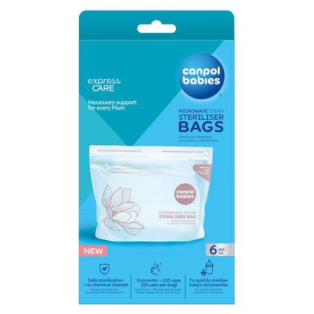 Punguțe pentru sterilizare în cuptorul cu microunde Canpol babies oferă o metodă simplă, rapidă și sigură de sterilizare a sticlelor, suzetelor, pompelor de sân și altor produse pentru bebeluși și copii. Sterilizarea este sigură, fără utilizarea substanțelor chimice, și durează doar 90 de secunde. Aburul generat în punguță în timpul procesului de sterilizare elimină bacteriile și germenii, asigurând o curățenie igienică a produselor. Fiecare pungă poate fi utilizată de până la 20 de ori, astfel încât o singură cutie este suficientă pentru 120 de procese de sterilizare. Acest produs înlocuiește sterilizatorul tradițional atunci când ești în călătorie și nu poți lua cu tine dispozitivul sau nu ai suficient loc acasă pentru un echipament suplimentar. Punguțele sunt fabricate dintr-un material sigur, fără BPA și alte substanțe dăunătoare.