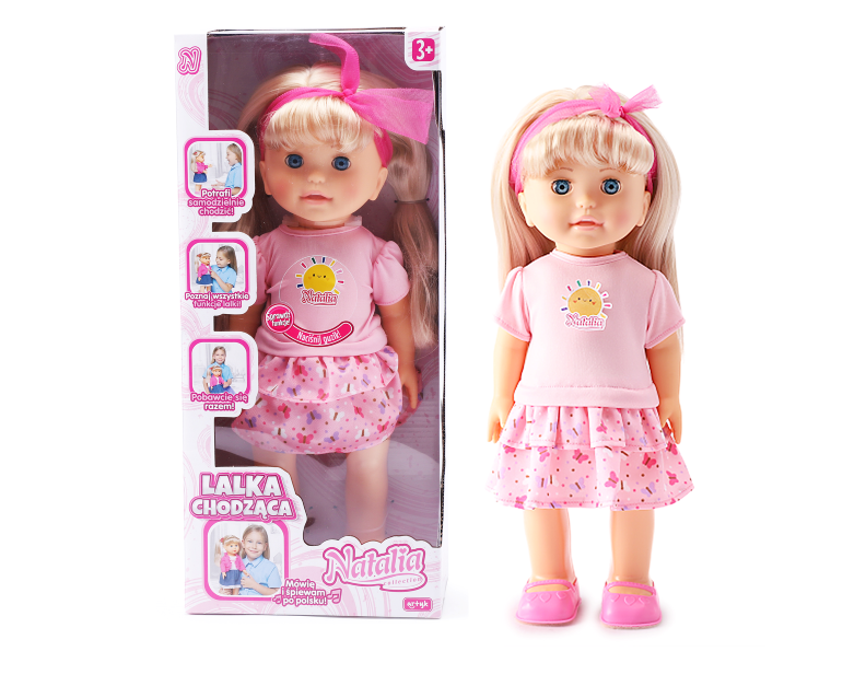 Vorbesc și cânt în poloneză. Pot merge singură. Setul include: – o păpușă rigidă de 40 cm. Funcții: – bate din palme de două ori pentru ca păpușa să înceapă să meargă. – apasă-i burtica pentru a cânta și a vorbi. – spune 7 fraze: * Bună, sunt Natalia, hai să ne jucăm împreună. * Când sunt tristă, mami îmi cântă cântece și mă simt imediat mai bine. * Am învățat un cântec nou la grădiniță, hai să-l cântăm împreună. * Îmi place foarte mult să cânt, e foarte distractiv. * Știu un alt cântec, e foarte frumos, îl cânți și tu cu mine? * Acum e rândul tău, cântă melodia ta preferată. * Poate mergem undeva împreună. – cântă 3 cântece: * autobuz * râde în hohote * unu, doi, trei, știi? – închide ochii – încearcă funcția mea – toate funcțiile se activează după comutarea comutatorului de pe spate. Alte informații: – dimensiunile ambalajului: 20 x 45 x 13 cm. – baterii: 3 x AAA 1.5V (demo inclus) – vârstă: 3+