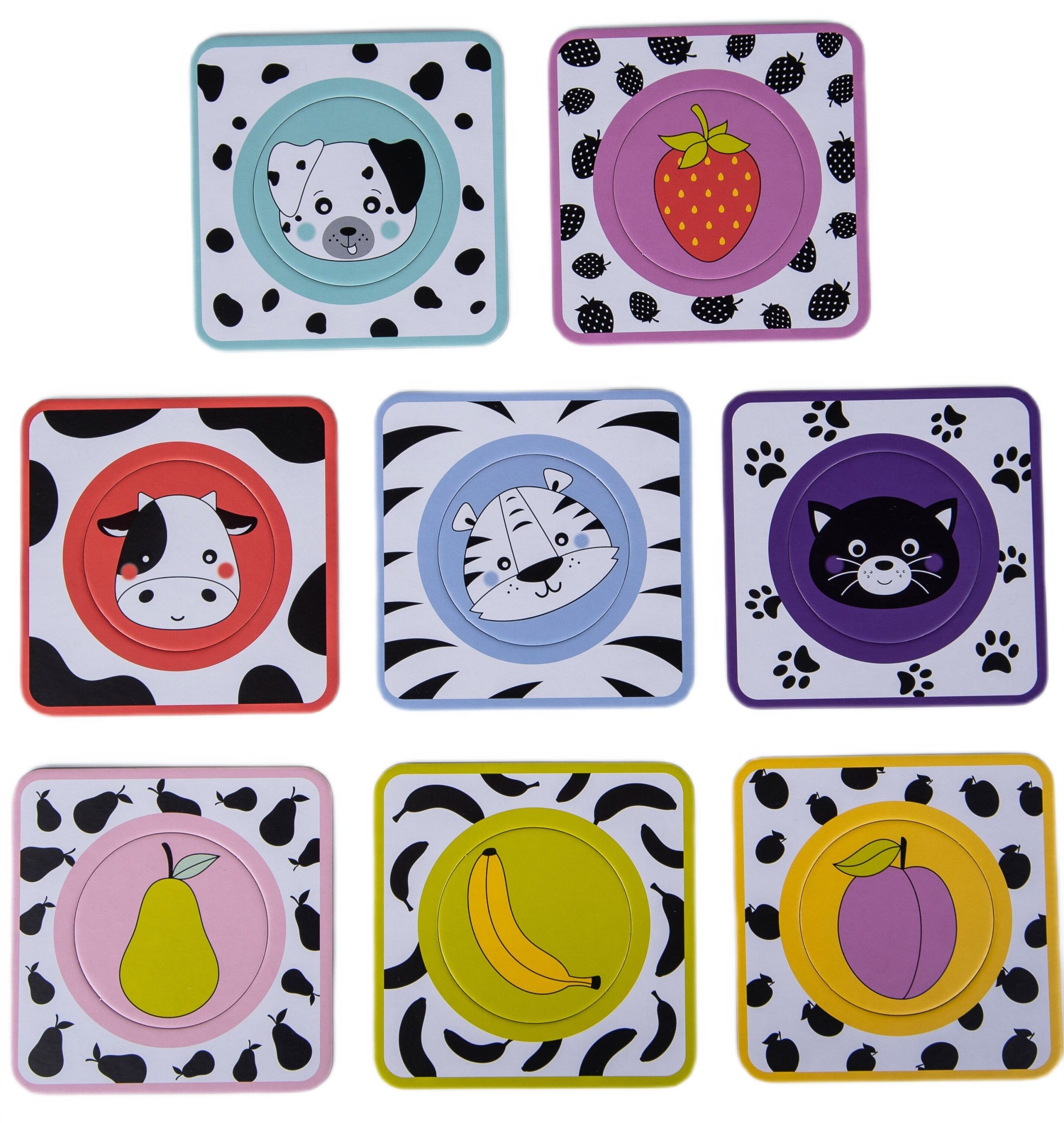 Puzzle-urile sunt compuse din tablă rotundă cu diverse modele, pe care se află fructe și fețe de animale. Aceste ilustrații colorate nu doar că atrag privirea, dar ajută și la învățarea recunoașterii diferitelor obiecte, dezvoltând totodată abilitățile motorii ale copilului prin asamblarea și potrivea elementelor.