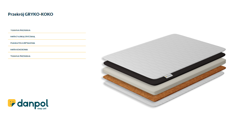 GRYKO-KOKO PLUS este o saltea dublă. Partea din hrișcă este singura saltea naturală pentru dormit. Cojile de hrișcă conținute în pătrate matlasate, special selectate, au proprietăți unice: • antialergice • antitranspirante • antidecubit • proprietăți care previn defectele coloanei vertebrale și susțin tratamentul celor existente. Un sistem special de fermoar permite scoaterea saltelei din hrișcă pentru curățare, iar husa suplimentară permite spălarea la mașină. Partea din nucă de cocos completează beneficiile saltelei pentru sănătate. Datorită structurii sale, salteaua din nucă de cocos permite circulația liberă a aerului. Indiferent de partea pe care doarme copilul dumneavoastră, puteți fi sigur că va dormi întotdeauna sănătos și în siguranță.