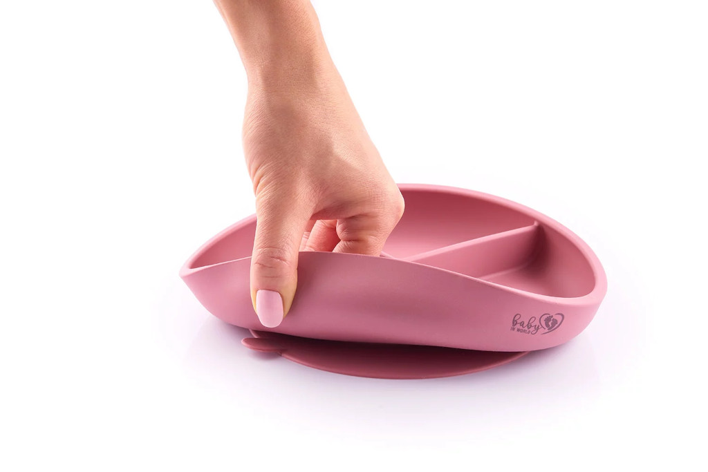 Această farfurie antiderapantă, formată din trei părți, cu ventuză, permite copilului dumneavoastră să mănânce independent, fără a fi nevoie să țină farfuria. Datorită ventuzei funcționale, farfuria nu se poate mișca, cădea sau lovi de pe masă. Este stabilă și sigură, neprețuită pentru a învăța să mănânce independent. Împreună cu un bol, farfuria creează setul perfect pentru a învăța să mănânce independent. Farfuria este fabricată din silicon 100% alimentar, de înaltă calitate, durabil, hipoalergenic, antibacterian și fără BPA, PVC și ftalați dăunători. Nu absoarbe mirosurile sau aromele, asigură o masă confortabilă și, mai presus de toate, este o încântare pentru ochi! Se poate spăla în mașina de spălat vase. Vârste + 6 luni. Caracteristici produs: Farfurie formată din trei părți 6 luni+ Diametru 18 cm Înălțime 3 cm Material: silicon – fără ftalați, BPA și PVC Se poate spăla în mașina de spălat vase pe raftul superior Se poate pune în cuptorul cu microunde