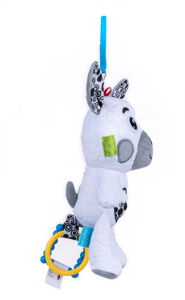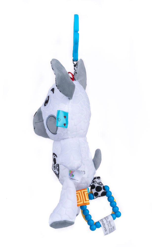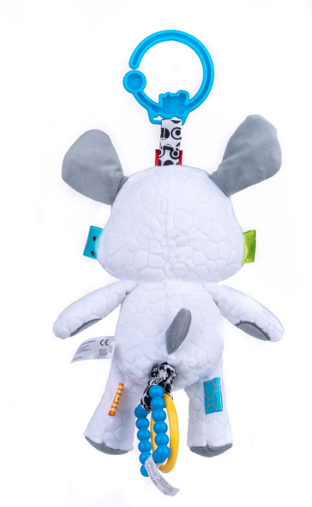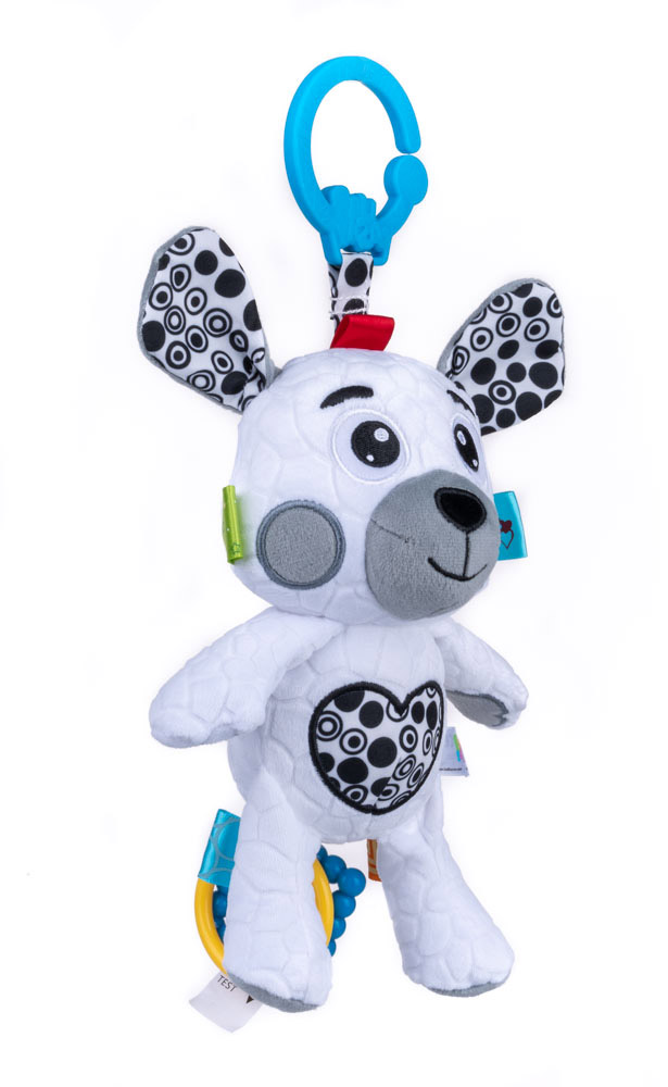 Acest prieten cățeluș va asigura un somn liniștit al micuțului tău. Prezintă modele contrastante care îi stimulează vederea și etichete colorate cu texturi variate. Jucăriile de dentiție atașate vor alina gingiile dureroase ale bebelușului tău care începe să adoarmă. Câinele cântă un cântec de leagăn frumos pentru a-l ajuta pe micuț să adoarmă, iar catarama practică permite așezarea confortabilă a acestuia în orice pătuț sau cărucior. Potrivită pentru copii de la naștere, această jucărie conține: – un pandantiv practic – o cutie muzicală – jucării de dentiție colorate – urechi foșnitoare – etichete cu texturi variate – potrivită pentru vârste de 0+