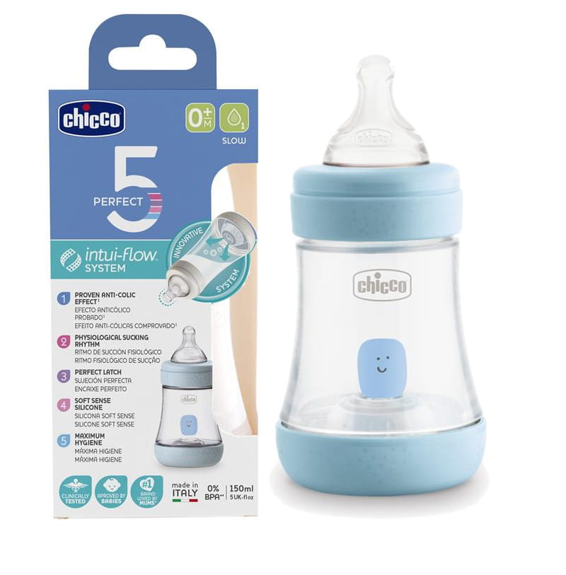 Biberonul antikolic Chicco Perfect5 este potrivit pentru copii de la naștere. Acesta dispune de un tetină PHYSIO cu flux liber și de o membrană EQUILIBRIUM, care previne înghițirea aerului în timpul hrănirii, reducând episoadele de colici*.