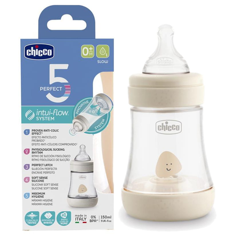 Revoluția anticolici de la Chicco! Nevoile nutriționale, precum și ritmul și intensitatea suptului, sunt unice pentru fiecare bebeluș și se schimbă pe parcursul zilei. Prin urmare, fiecare moment de hrănire este unic. Biberonul biofuncțional anticolici de la Chicco este conceput pentru a asigura că hrănirea are loc în armonie cu natura. AMBALAJUL INCLUDE: biberon de 150 ml Tetină 0m+ Fără BPA Fabricat în Italia și compatibil cu pompa de sân manuală Chicco, biberonul anticolici Chicco Perfect5 este potrivit pentru bebeluși de la naștere. Este prevăzut cu o tetină PHYSIO cu flux lent și o membrană EQUILIBRIUM, care împiedică înghițirea aerului în timpul hrănirii, reducând episoadele de colici*. *Test de consum pe 450 de bebeluși, Italia, 2019. Perfect5 este un biberon biofuncțional care susține hrănirea intuitivă și fiziologică, adaptându-se nevoilor bebelușului. Totul se datorează sistemului inovator INTUI-FLOW™, care combină membrana EQUILIBRIUM cu tetina PHYSIO. Membrana Equilibrium și tetina Physio previn înghițirea aerului în timpul hrănirii, reducând iritabilitatea, regurgitația și colicile. Biberonul Chicco Perfect5 oferă: Acțiune anticolicică dovedită – Membrana Equilibrium și tetina Physio previn înghițirea aerului în timpul hrănirii, reducând iritabilitatea, regurgitația și colicile – confirmat de 96% dintre mame*. Ritm fiziologic de supt – Biberonul urmează ritmul unic și fiziologic de supt al bebelușului, permițând o hrănire continuă și lină, fără întreruperi sau dificultăți de respirație. TESTAT CLINIC.** Potrivire perfectă – Tetina Physio se adaptează perfect la gura bebelușului și imită modelul său natural de supt. Este acceptată de 9 din 10 bebeluși.* Silicon Soft Sense – Tetina moale și flexibilă, cu finisaj Soft Sense, oferă o experiență plăcută și naturală de supt pentru bebelușul dumneavoastră. Igienă maximă și ușurință în curățare – Baza deșurubată face curățarea tuturor părților biberonului rapidă și ușoară. Sistemul Intui-Flow combină membrana EQUILIBRIUM cu tetina PHYSIO: Membrana Equilibrium – În timpul suptului, MEMBRANA EQUILIBRIUM de la baza biberonului este activată, eliberând fluxul de aer, prevenind crearea unui vid în interior. Accesul aerului de la baza biberonului împiedică amestecarea acestuia cu laptele și înghițirea acestuia de către bebeluș. Flexibilitatea valvei dinamice anticolici permite micro-mișcări pentru a răspunde nevoilor bebelușului – în funcție de intensitatea suptului, fluxul de aer este ajustat continuu, asigurând o hrănire lină și regulată, fără întreruperi sau dificultăți de respirație. Tetină Physio: FORMĂ SIMETRICĂ, PLATĂ ȘI ALUNGITĂ: imită mamelonul mamei, care își schimbă ușor forma atunci când bebelușul suge – tetina este alungită și lărgită pentru a promova mișcările naturale ale limbii în timpul suptului, SUGGERE UȘOARĂ: tetina urmează modelul fiziologic de supt al bebelușului, VALVĂ ANTI-COLICĂ: situată la baza tetinei, previne colapsul acesteia și împiedică bebelușul să înghită aer, reducând astfel episoadele de colici și permițând o hrănire lină și calmă, SILICON SOFT SENSE: un finisaj special face tetina catifelată și moale la atingere, asemănându-se cu pielea mamei, asigurând o supt și mai naturală și confortabilă, ACCEPTARE RIDICATĂ: acceptată de 9 din 10 bebeluși