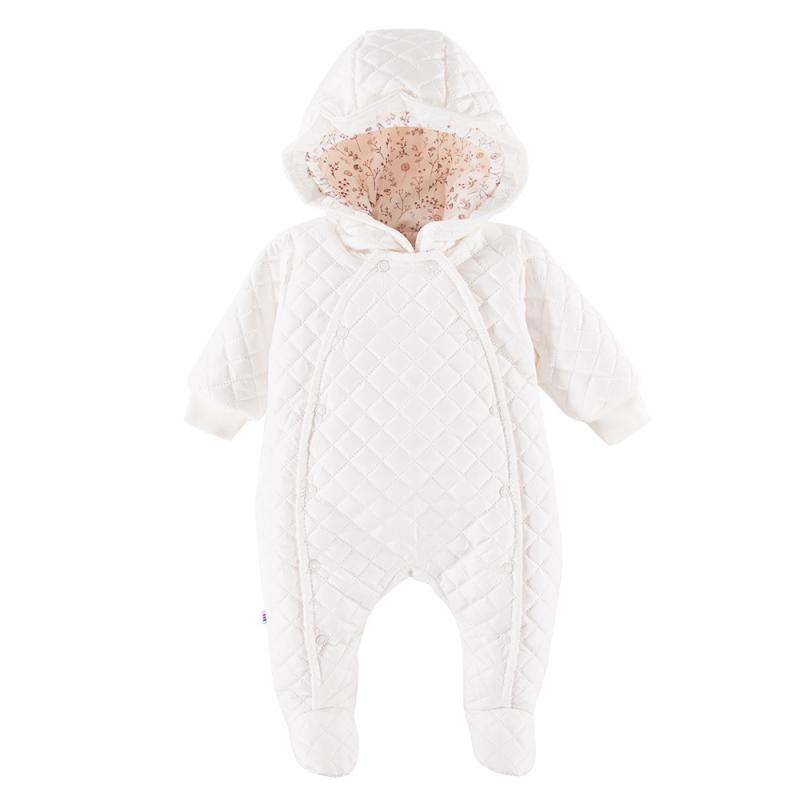 Kombinezonul pentru bebeluși cu picioare din colecția Bloom este perfect pentru zilele de iarnă. Este realizat dintr-un material textil care oferă o excelentă protecție împotriva frigului, ploii și vântului. Are o strat suplimentar de izolație și este căptușit cu bumbac în interior. Gluga este echipată cu o bandă elastică care împiedică desprinderea ei și protejează capul copilului de frig. Kombinezonul se închide cu capse.